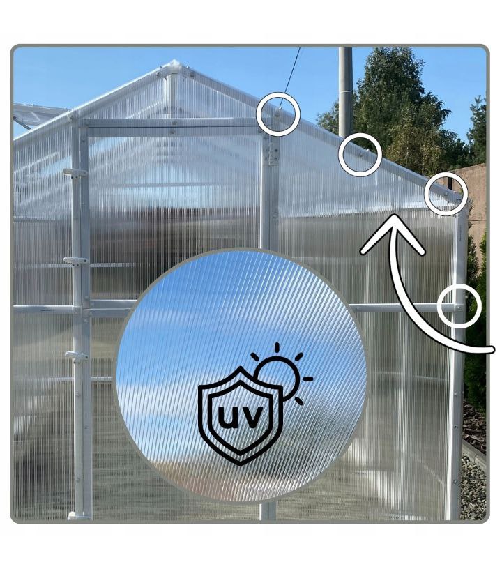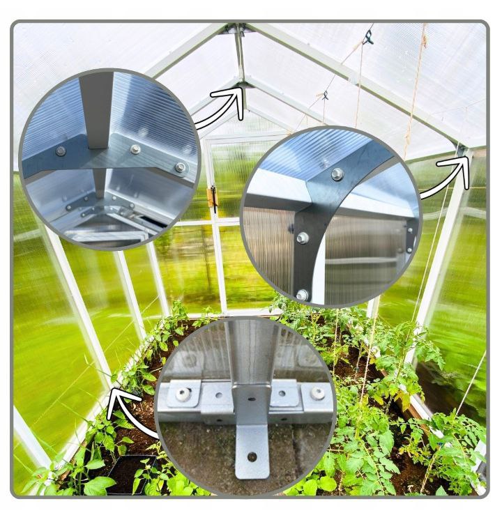 Łączenie – to nie tylko wytrzymałe szybkozłączki, które po skręceniu nadają stabilności szklarni ale i zastosowanie dodatkowych wzmocnień w ilości aż 9 sztuk. Wzmocnienia mocowane w szczycie dachu oraz w miejscu łączenia ściany dachowej oraz bocznej są wykonane z blachy ocynkowanej 2mm.