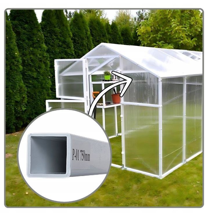 Profil PCV zamknięty 30x30mm o grubości ścianki 1,5mm oraz profil stalowy zamknięty 30x30mm o grubości ścianki 1mm– to dzięki profilom zamkniętym oraz zastosowaniu odpowiedniej grubości ścianki szklarnia zyskuje swoją odporność na niekorzystne warunki atmosferyczne takie jak śnieg czy wiatr.